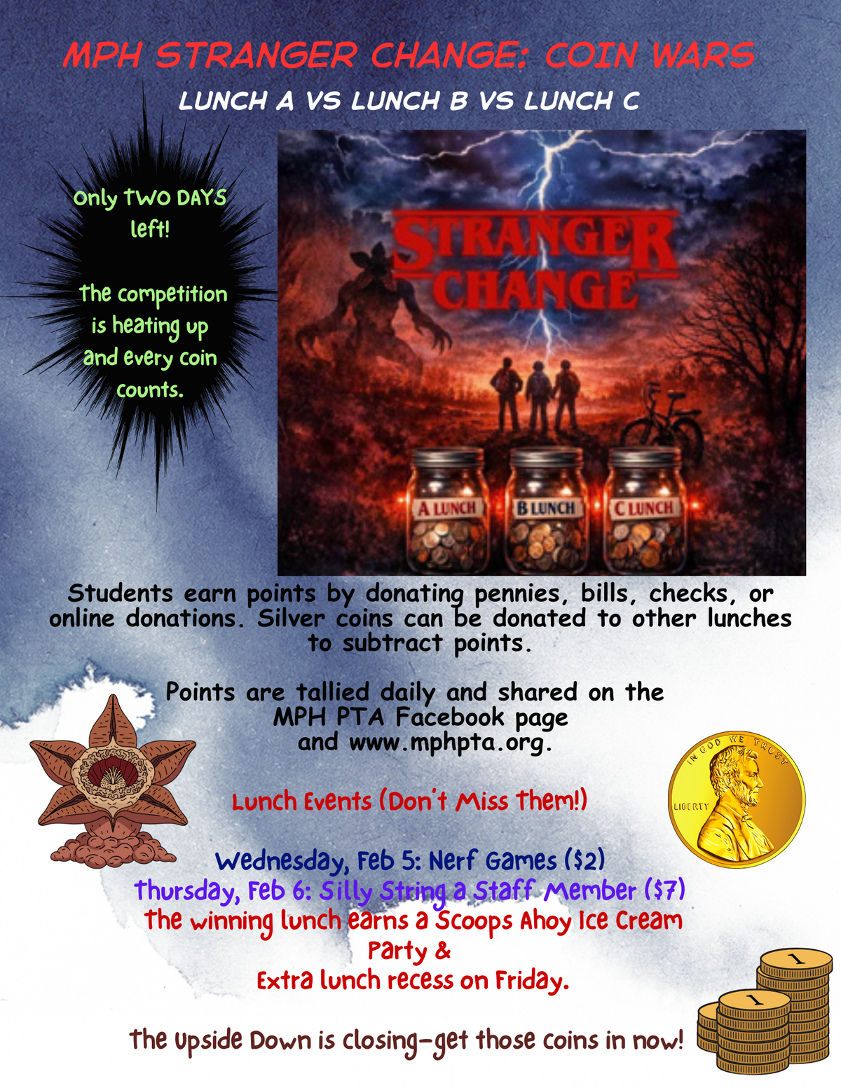 MPH has one day left of the Stranger Change Coin Wars! Lunches A, B, and C are battling it out, and the competition is heating up, and the Upside Down is closing fast! Students are eager to get their coins in..every penny counts!