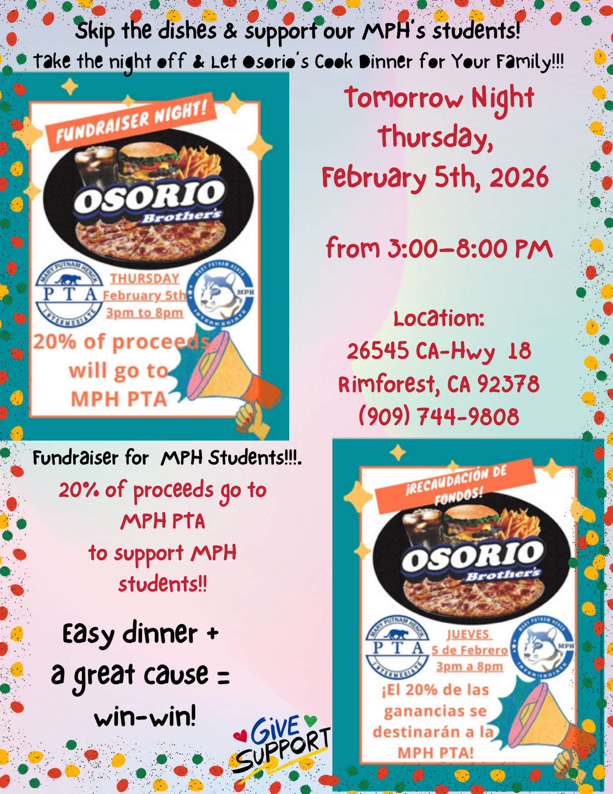 ALSO TONIGHT, MPH is hosting a fundraiser at Osorio's in Rim Forest. Let's show our support and let Osorio's handle dinner: no cooking, no dishes, just good food for a cause!