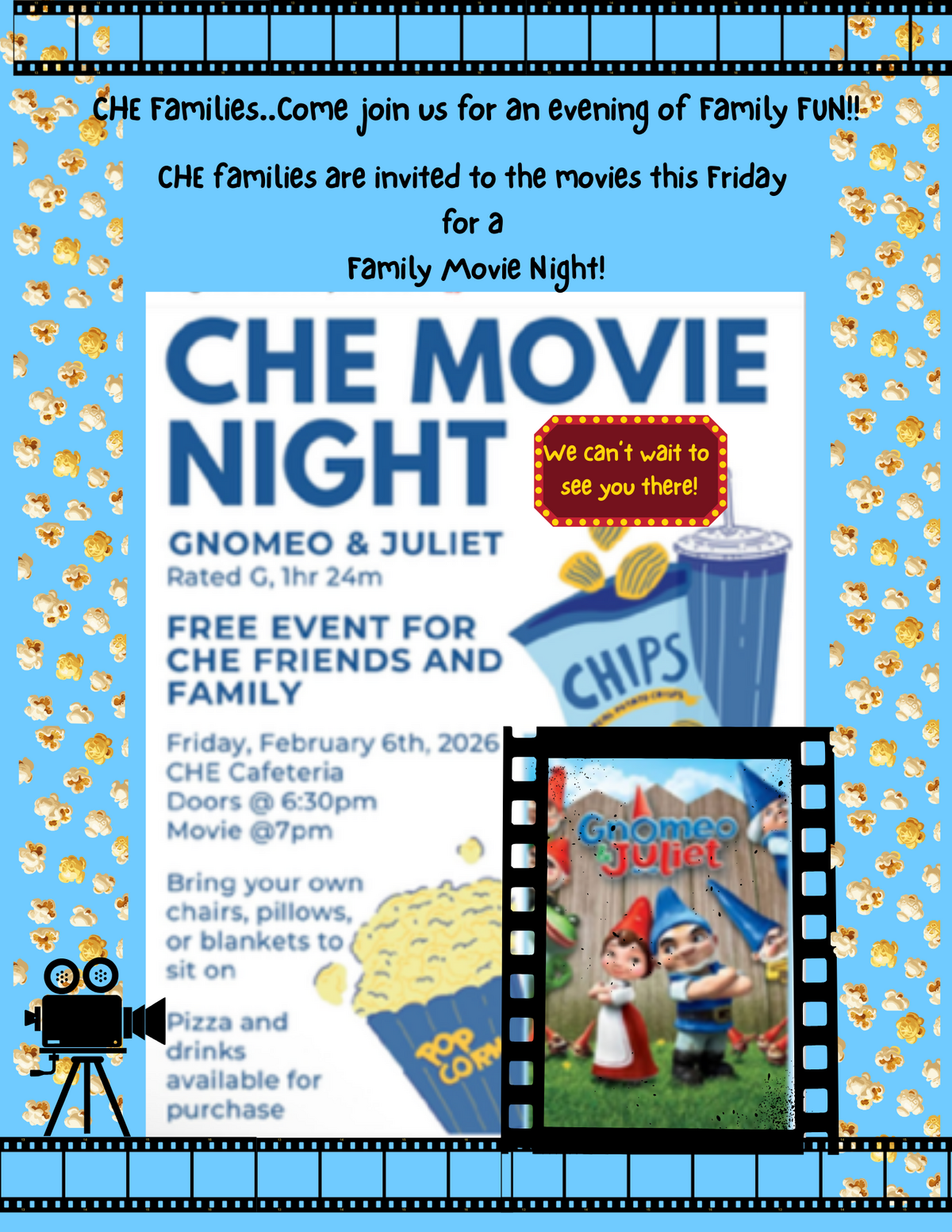 for a  Family Movie Night! CHE Movie Night. Gnomeo & Juliet for CHE Friends & Family.  Friday, February 6th, 2026. VHE Cafeteria. Doors open at 6:30 pm; movie at 7:00 pm. Bring your own chairs, pillows, or blankets to sit on. Pizza and drinks are available for purchase.