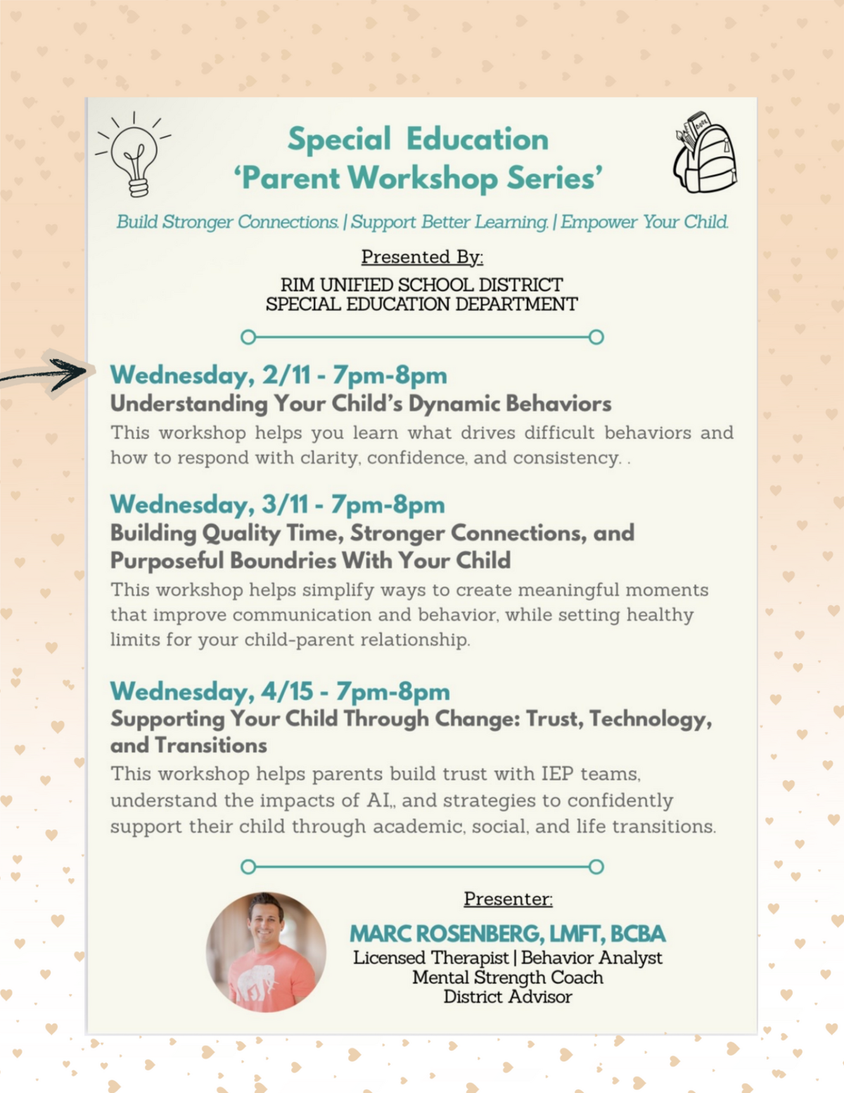 Wednesday, 4/15, 7 pm - 8 pm: Supporting Your Child Through Change: Trust, Technology, and Transitions: This workshop helps parents build trust with IEP teams, understand the impact of AI, and strategies to confidently support their child through academic, social, and life transitions. Presenter: Marc Rosenberg, LMFT, BCBA