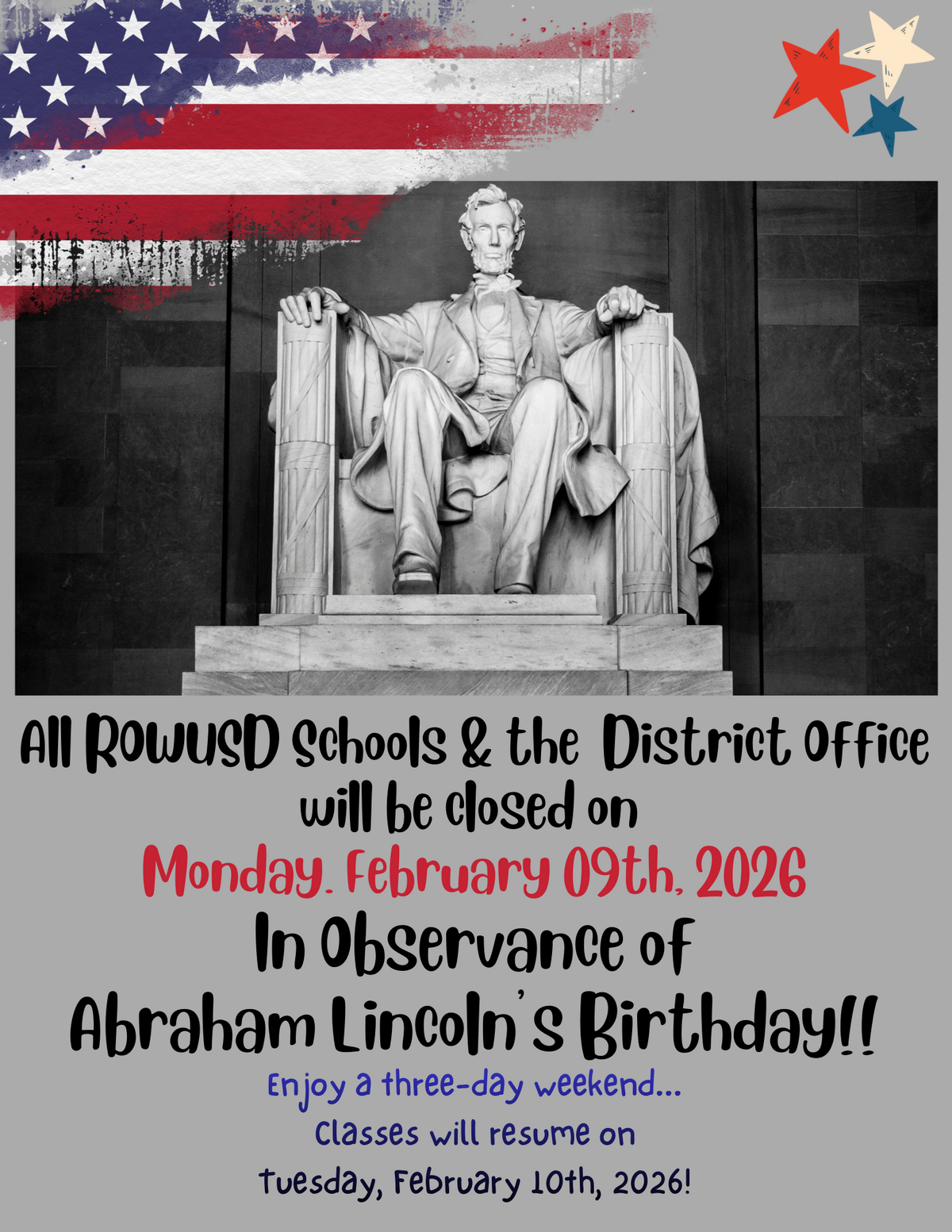 Page: All ROWUSD Schools & the  District Office will be closed on  Monday. February 09th, 2026 In Observance of Abraham Lincoln’s Birthday!! Enjoy a three-day weekend... Classes will resume on Tuesday, February 10th, 2026!