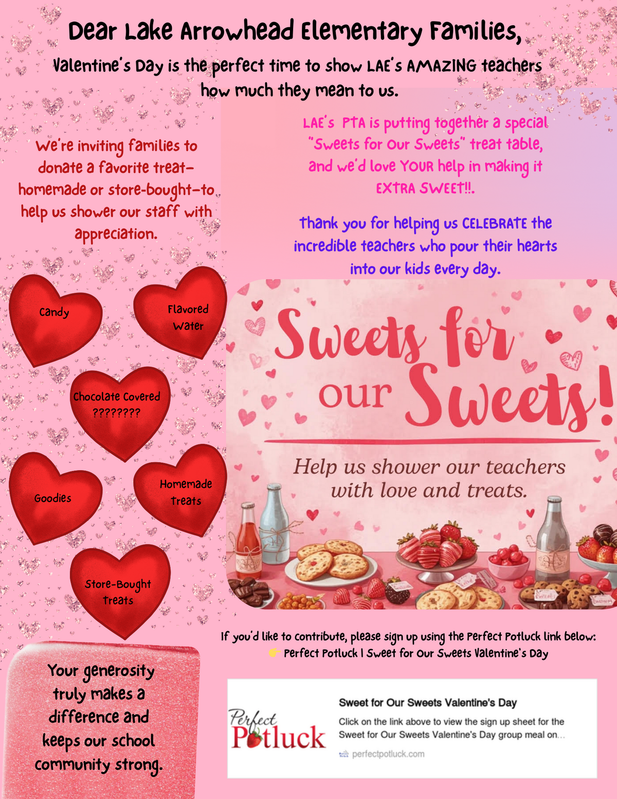 Page:  Dear Lake Arrowhead Elementary Families, Valentine’s Day is the perfect time to show LAE’s AMAZING teachers how much they mean to us. LAE’s  PTA is putting together a special “Sweets for Our Sweets” treat table, and we’d love YOUR help in making it EXTRA SWEET!!. We’re inviting families to donate a favorite treat—