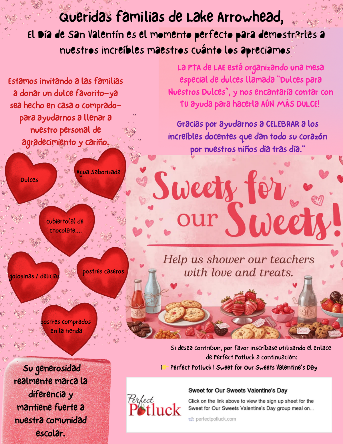 La PTA de LAE está organizando una mesa especial de dulces llamada “Dulces para Nuestros Dulces”, y nos encantaría contar con TU ayuda para hacerla AÚN MÁS DULCE! Gracias por ayudarnos a CELEBRAR a los increíbles docentes que dan todo su corazón por nuestros niños día tras día." Estamos invitando a las familias a donar un dulce favorito—ya sea hecho en casa o comprado—para ayudarnos a llenar a nuestro personal de agradecimiento y cariño. Su generosidad realmente marca la diferencia y mantiene fuerte a nuestra comunidad escolar. Si desea contribuir, por favor inscríbase utilizando el enlace de Perfect Potluck a continuación: I👉 Perfect Potluck | Sweet for Our Sweets Valentine's Day. Dulces, Agua Saborizada, cubierto(a) de chocolate...., golosinas / delicias, postres caseros, postres comprados